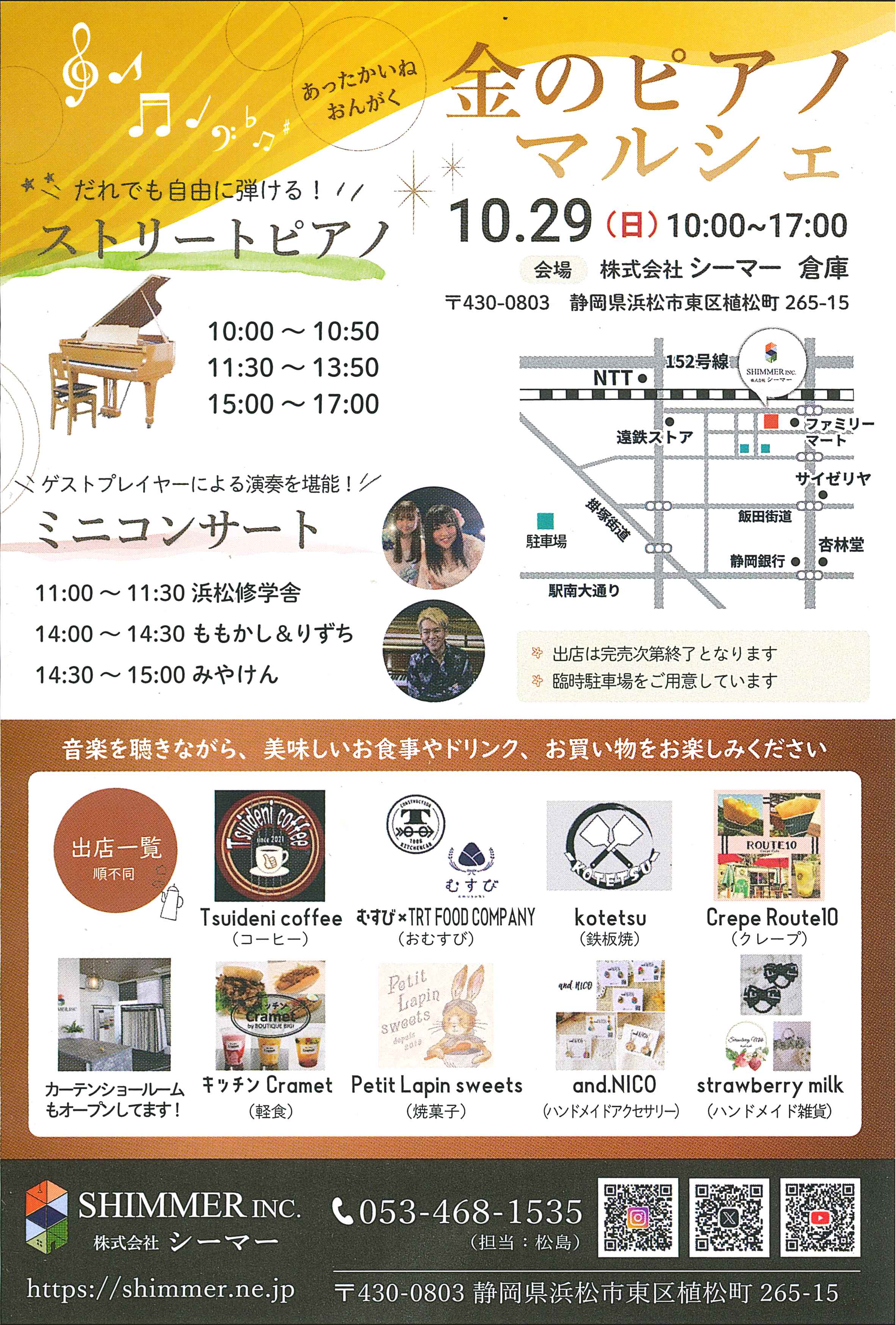 2023年10月29日(日)に、 浜松市東区植松町265-15にある株式会社シーマーさんの倉庫にて金のピアノマルシェが開催されます。