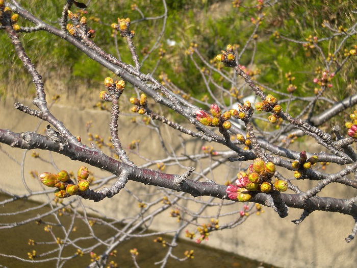 数百メートル川沿いを南へ行ったところの桜はすでに咲いています。